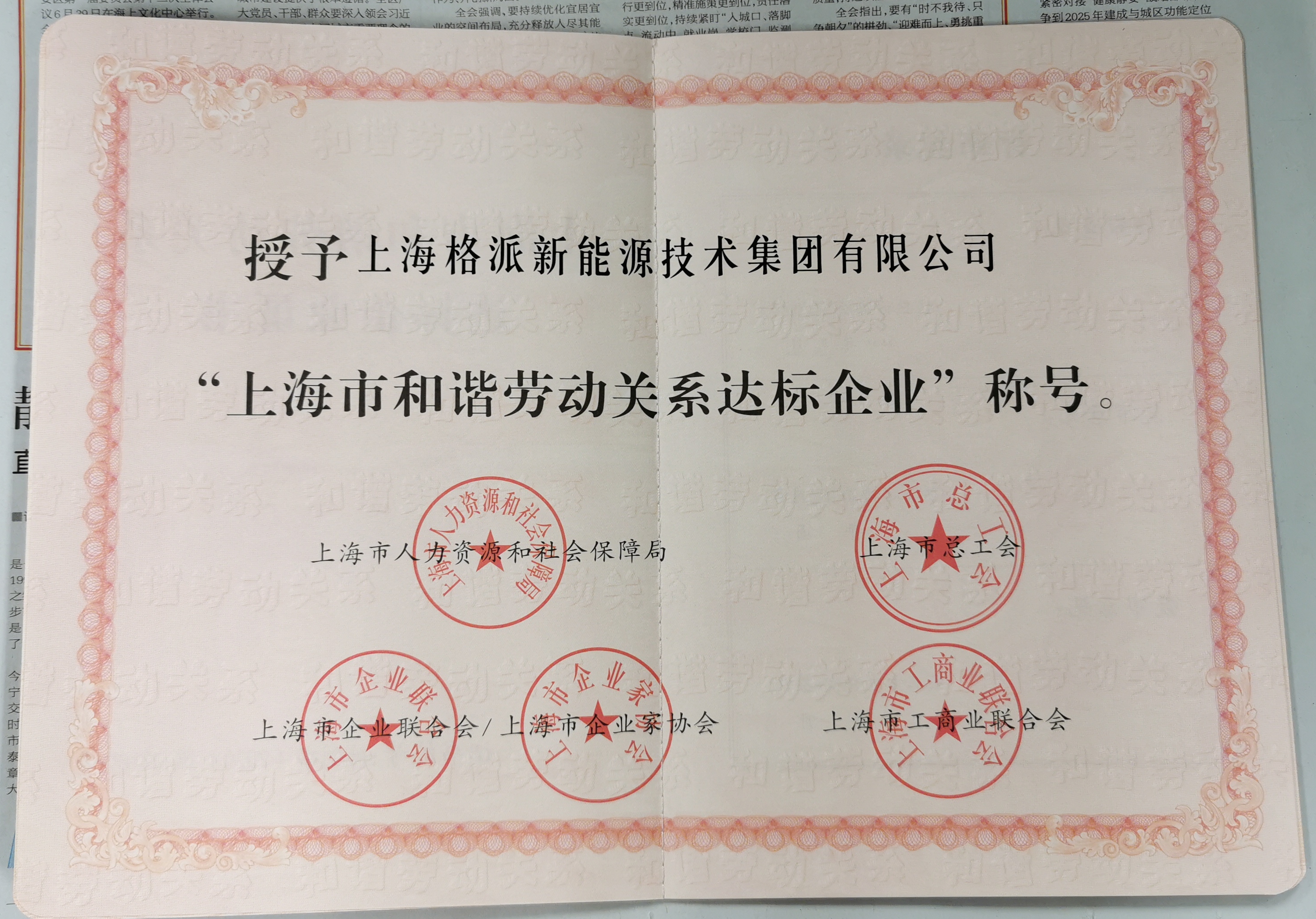 為推動企業(yè)建立和諧穩(wěn)定的勞動關(guān)系,維護(hù)企業(yè)和職工雙方的合法權(quán)益,上海市深入開展和諧勞動關(guān)系創(chuàng)建活動。上海市人社局、市總工會、市企業(yè)聯(lián)合會/企業(yè)家協(xié)會、市工商業(yè)聯(lián)合會聯(lián)合下發(fā)了《關(guān)于授予“上海市和諧勞動關(guān)系達(dá)標(biāo)企業(yè)”稱號的決定》,上海格派新能源技術(shù)集團(tuán)有限公司被授予“上海市勞動關(guān)系達(dá)標(biāo)企業(yè)”稱號。